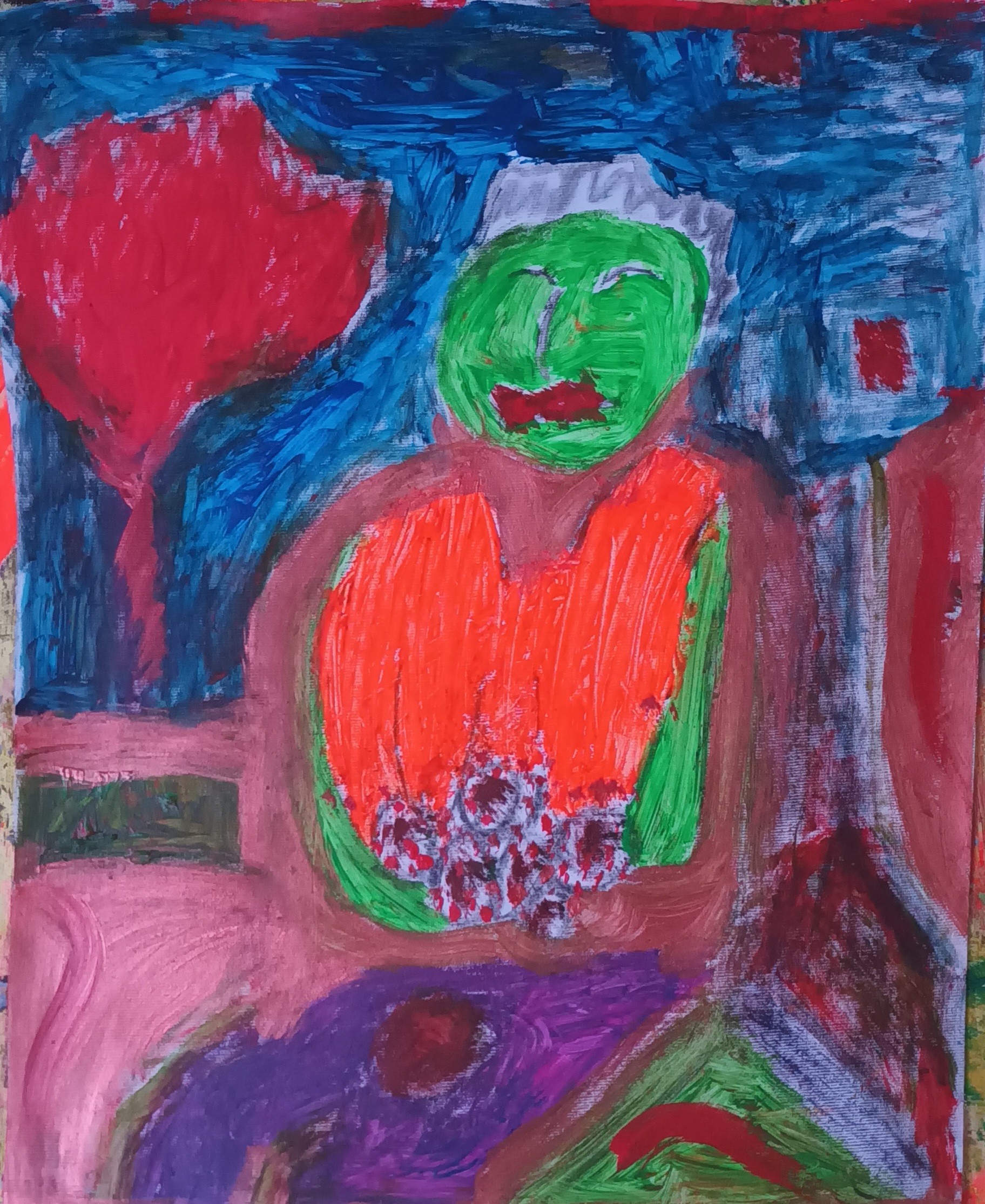 La niña de las naranjas, visión Garlo, diciembre 2024. Obra pictórica «participativa» iniciada por @juanjogarloartecordoba, en la que los visitantes pudieron ir plasmando los colores en la pintura, siendo este el resultado final. Con unas dimensiones de 39×33 cm, la técnica utilizada es acrílico sobre tela de lino, empleando utensilios como pincel y espátula. La pieza refleja una experiencia única de arte colaborativo en el Patio de la Casa Natal de Julio Romero de Torres.